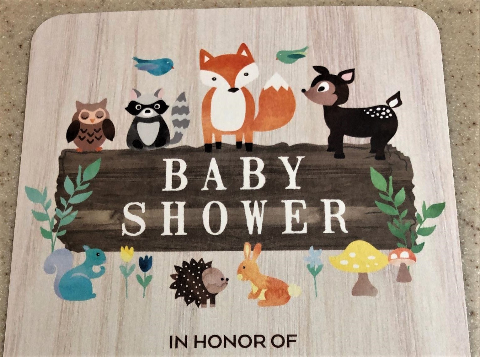 It took me 4 days to draw my lines and get the squares trimmed and starched, and and then my mom called and asked if I could make a baby quilt for a friend of hers. Of course! I was tickled that she asked. The theme is woodland critters. She told me that the invitation was cute so I asked her to have the neighbor, who is also a friend of ours, send me a photo of it: